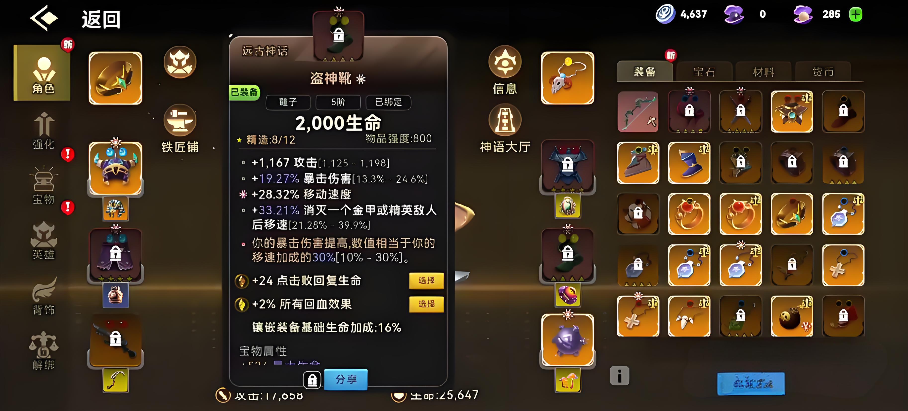 3、装备搭配推荐盗神靴冥光战甲等套装,侧重提升攻速移速与生命值,助力快速脱离危险寻找最佳输出位置。