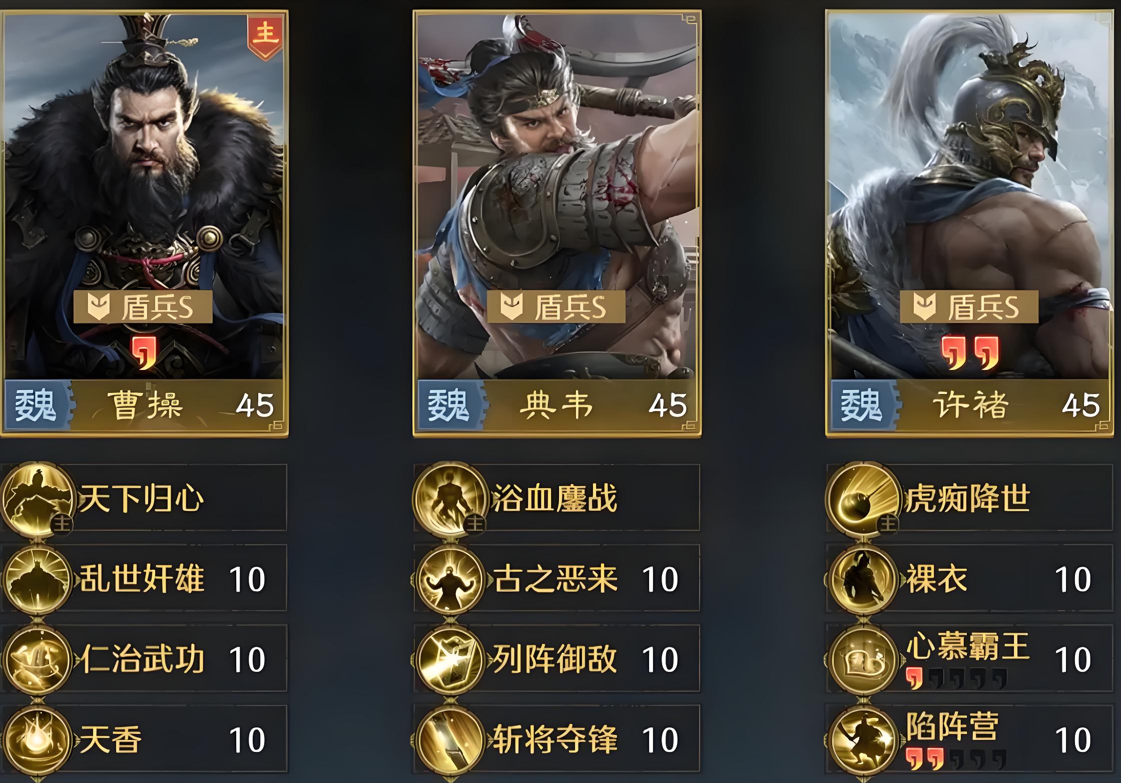 1、核心武将为曹操典韦许褚,三者兵种适性均达盾兵S级,典韦许褚前排负责输出反击,曹操专注治疗减伤增伤,分工明确形成战力闭环。