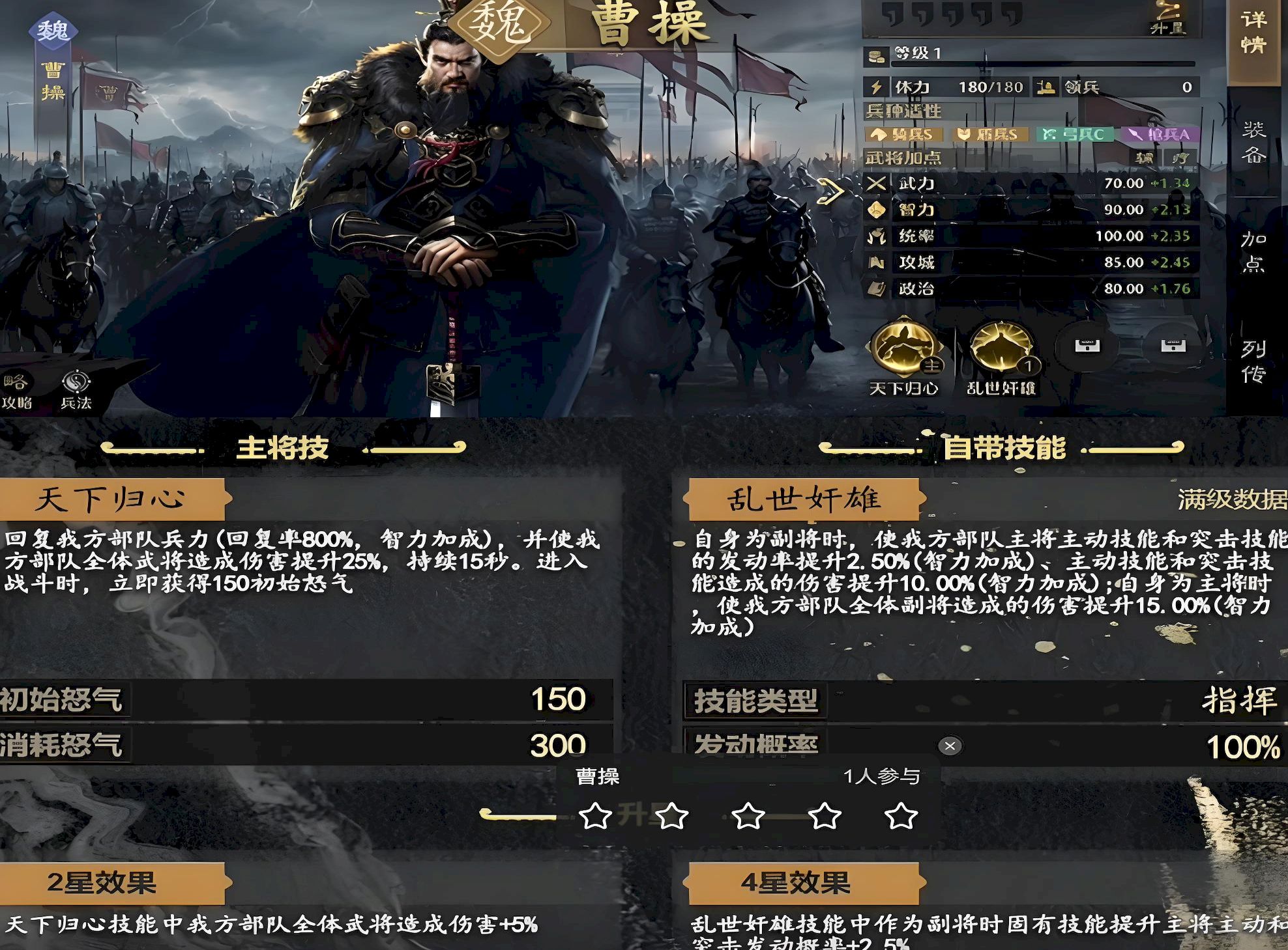 2、曹操可搭配仁治武功刮骨疗毒等技能强化治疗,辅以天香坚阵合一提升减伤增伤,自带天下归心技能回复兵力并增加全体伤害。