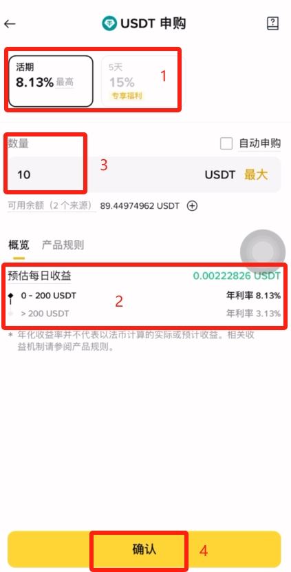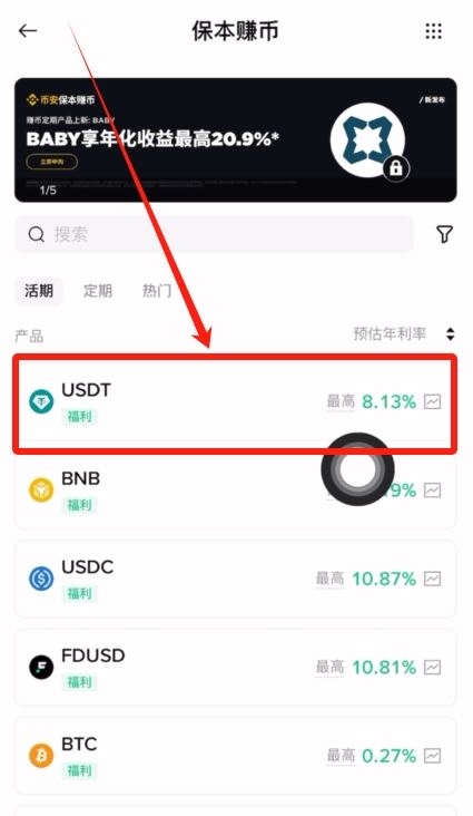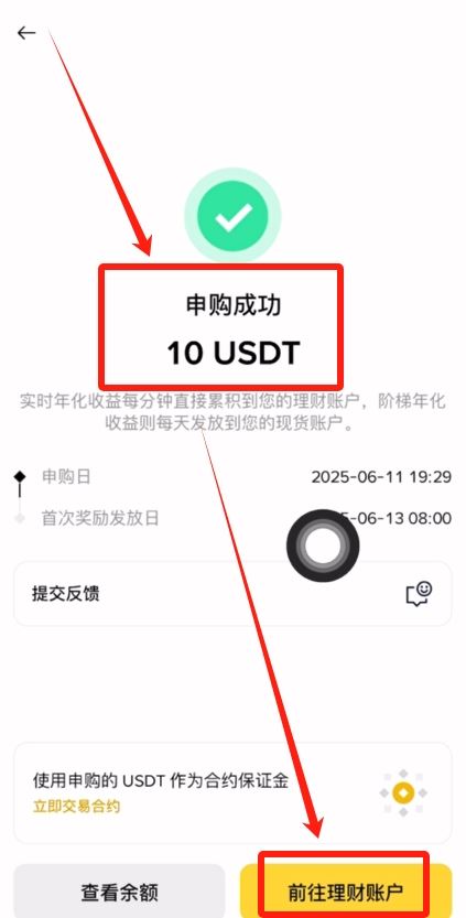 登录APP后点击顶部【理财】入口,进入保本赚币专区。以USDT产品为例,活期年化收益可达8.13%,输入申购金额后确认即可完成投资。