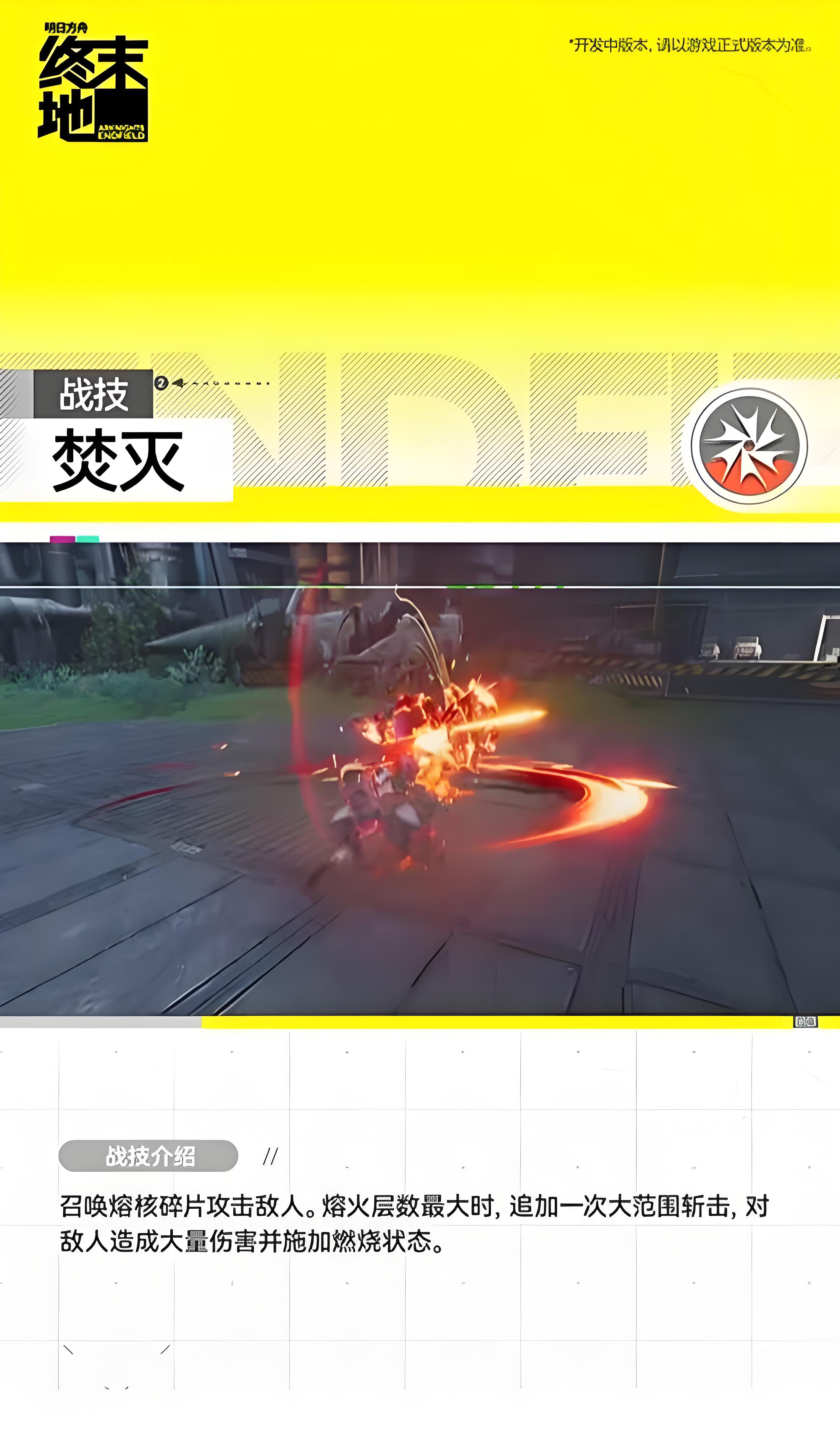 3、战技为焚灭,可召唤熔核碎片攻击敌方,熔火层数达最大时会追加一次大范围斩击,造成大量伤害且给敌方施加燃烧状态。