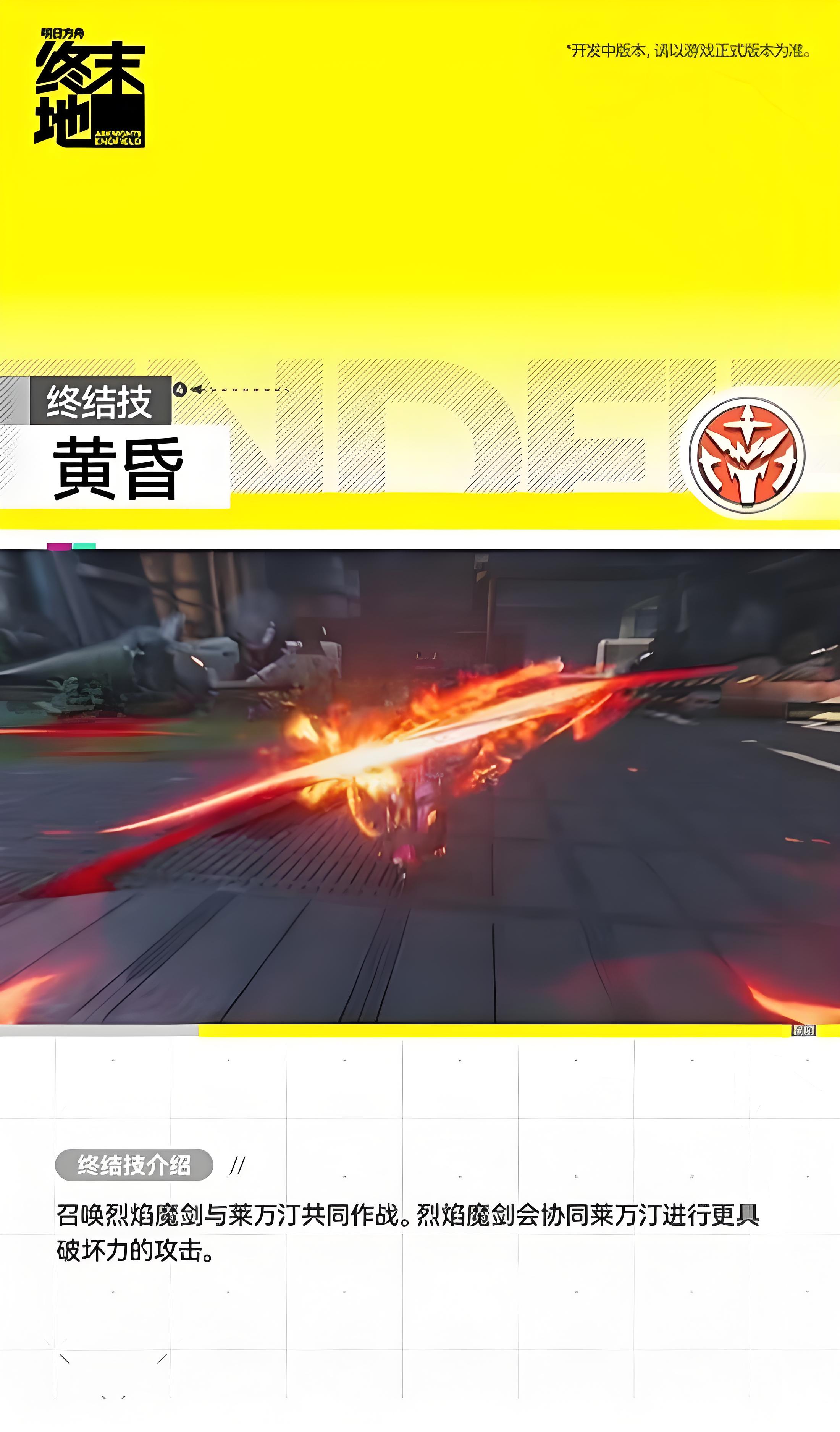 4、终结技为黄昏,能召唤烈焰魔剑和自身协同作战,魔剑会配合本体发起更具破坏力的攻击,显著提高整体输出能力。