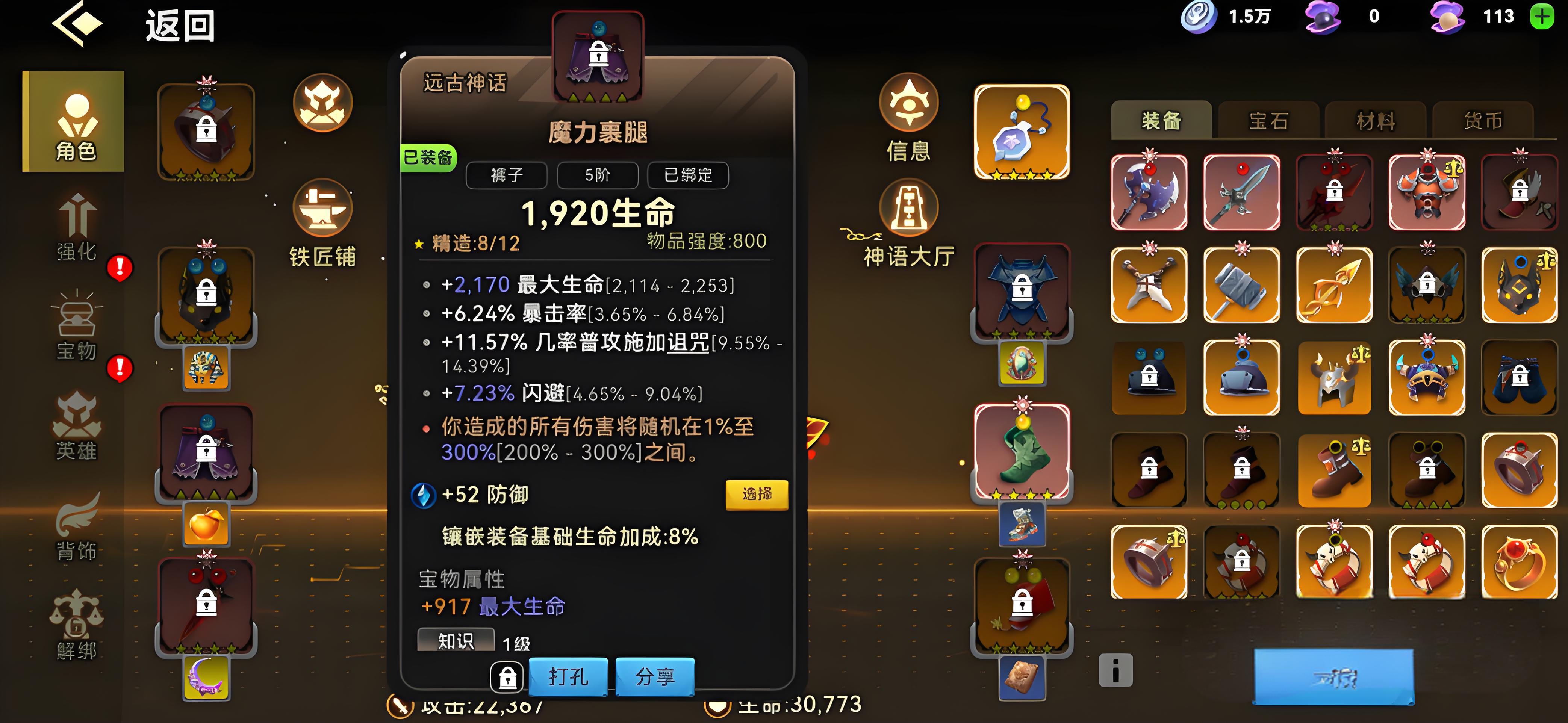 1、核心装备含四件神话级贴身装与地狱行者,地狱行者是关键增伤装备,魔力护腿适用高频攻击,冥光战甲可激活普攻触发技能效果。