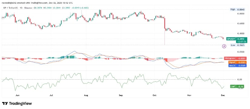 MACD仍为负值,尽管柱状图趋于平缓,但仍反映动能不足而非转向看涨压力。这种冷却阶段表明卖压正在缓解,但买家尚未展现决心。
