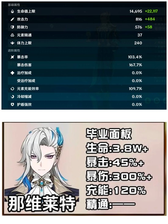 2、毕业属性需生命值达38W以上,暴击率超45,暴击伤害突破300,元素充能效率维持120,元素精通无具体数值要求即可达标。