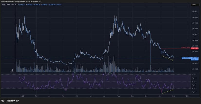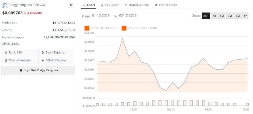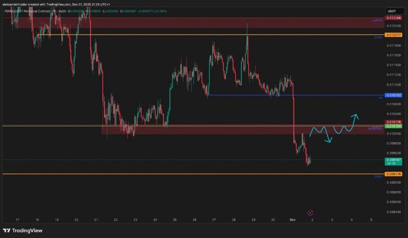 截至2025年12月2日,PENGU交易价约为0.00976美元,日内下跌9%,市值超6.13亿美元。尽管近期回调,分析师认为若买家能守住关键价位,历史需求区附近的盘整或带来短期机会。