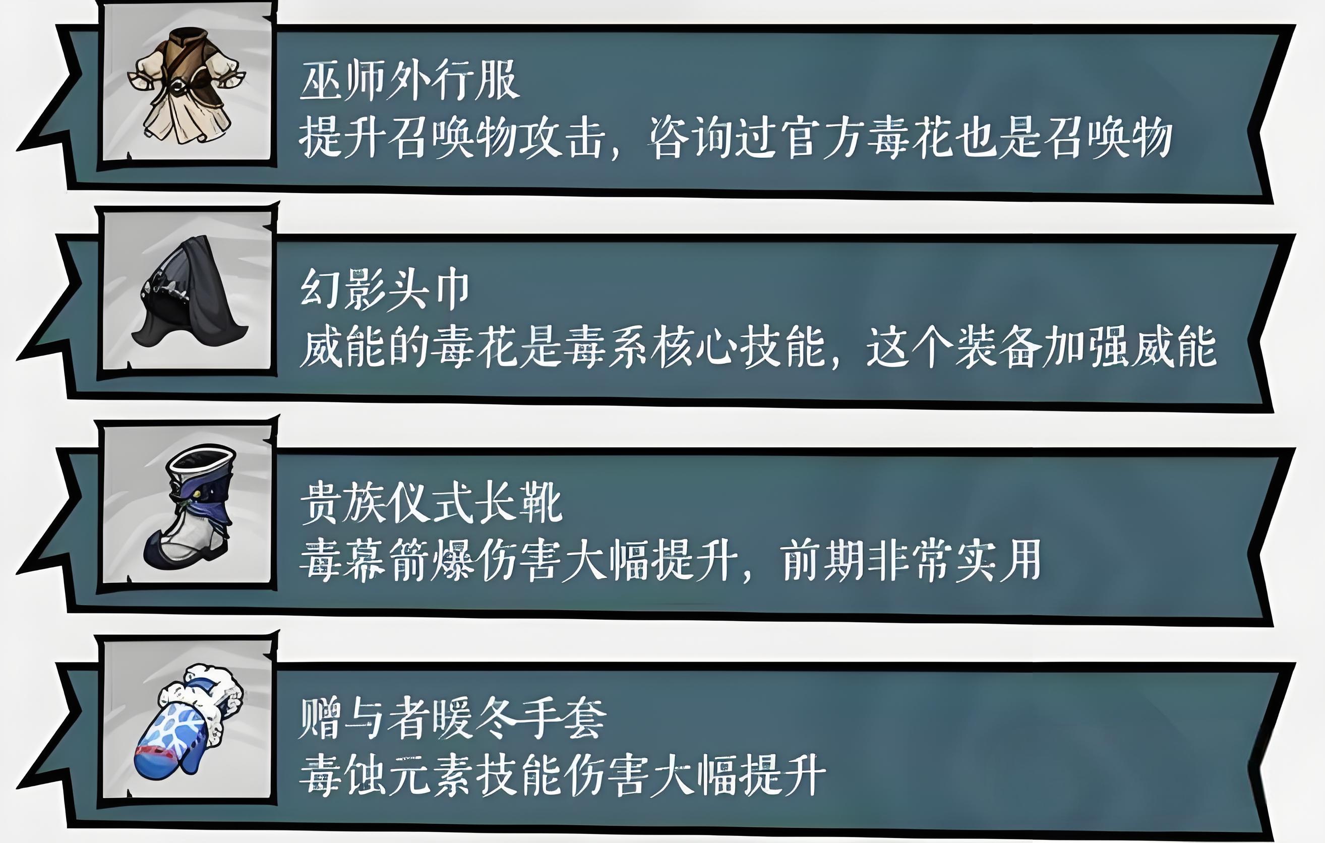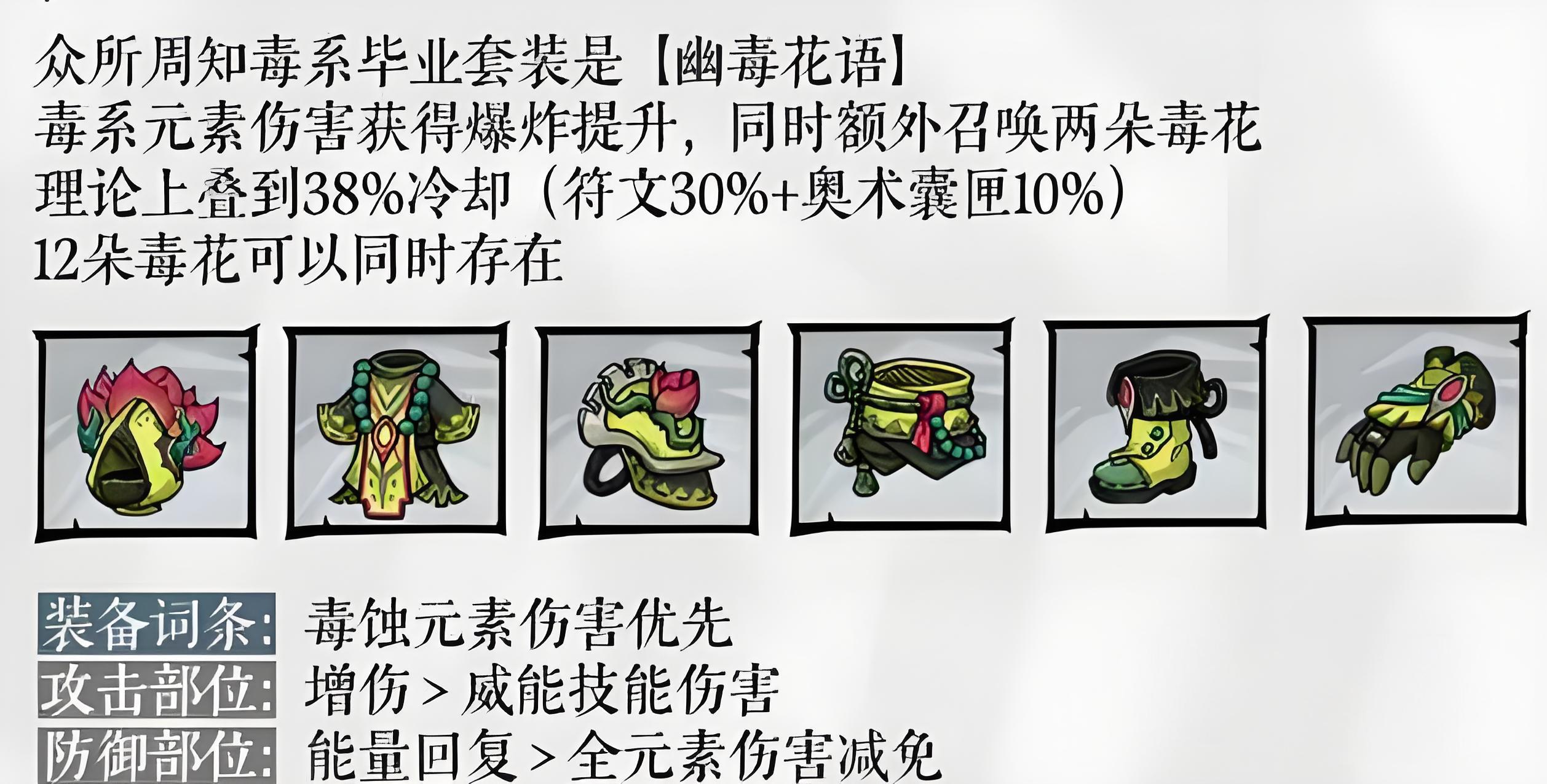 2、毕业装备选幽毒花语套装,可增毒伤并多召两朵毒花,搭配符文与奥术囊甲达38%冷却可共存12朵毒花。