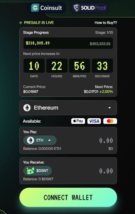 当前DSNT处于第一阶段预售,单价0.01667美元。参与流程简明:1.配置加密签报 2.充值ETH/BNB/SOL 3.TGE后领取代币 4.通过质押获取额外收益。值得注意的是,代币价格将随预售阶段推进阶梯式上涨。