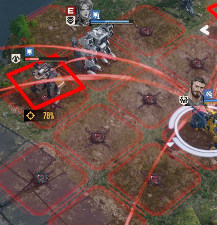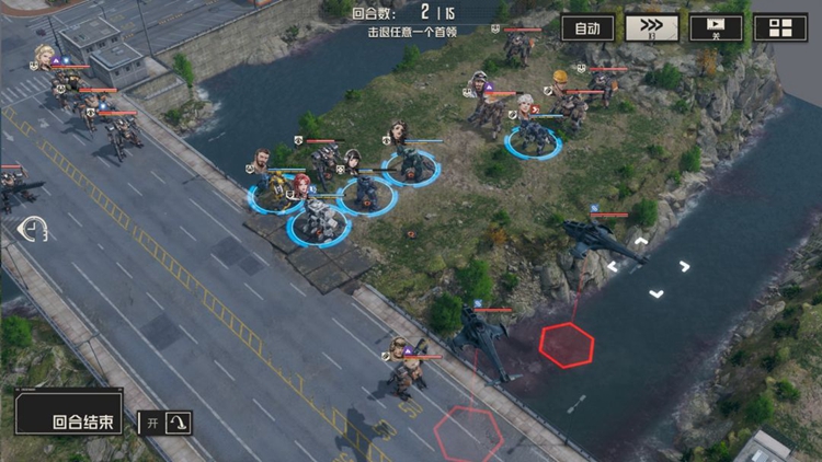 对于这三个boss,我们攻击的第一优先级是中间的地雷boss,故此,开局应向中部突破,快速将地雷boss消灭;到第三回合时,电磁炮boss和长柄boss会来到中间时,此时根据预期,我们应该已经将地雷boss消灭,关于这两个boss,需要先消灭长柄boss,因为电磁炮有充能时间,不具有持久威胁,也没有携带其他武器,所以我们可以先消灭长柄boss
