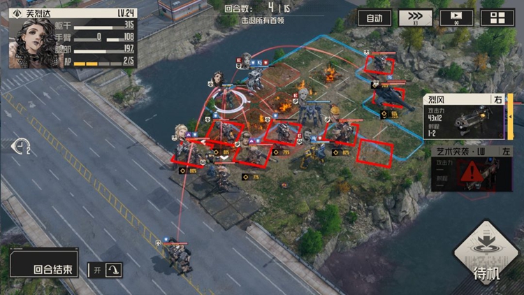 黛娜和芙烈达站位靠前,需要注意的是芙烈达必须携带一把机枪,以获得3射程攻击能力,第一回合就能攻击到boss,安娜站中间确保援护范围。