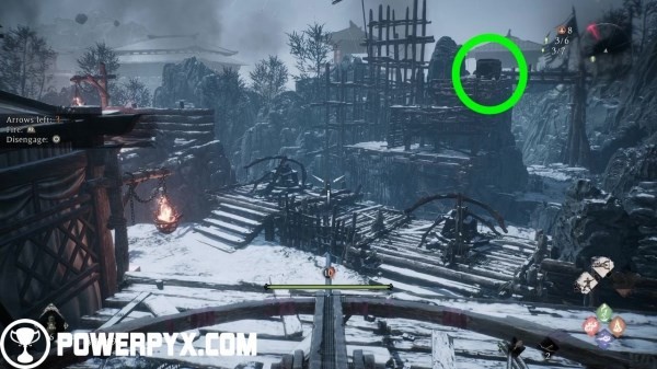 龙脉精华(虎牢众鏖兵):从战旗被挥舞斧头的士兵腐蚀的营地,操纵战旗右侧的弩炮,摧毁面前脚手架上的木路障。然后,爬上平台,用它到达箱子。