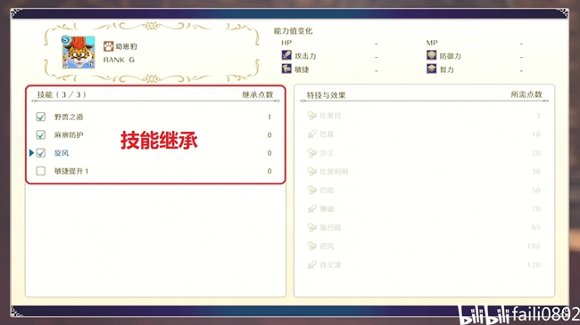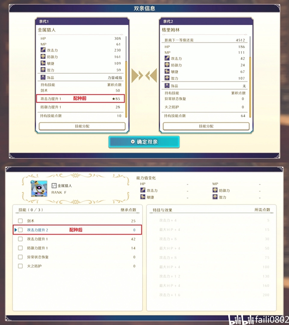 上面④说的内容有一个特殊情况,当亲代有一项技能的技能点分配满了并且这个技能可以升级时,在配种选择继承后这项技能将会升级,例如亲代的“攻击力提升1”已经分配满85点,配种并选择技能后“攻击力提升1”技能会升级成“攻击力提升2”,并且升级后的技能所加的能力也更多。