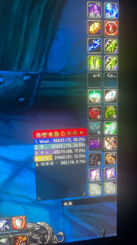 Tip3:武器的选择是快是慢,说实话我没有测试,就拿阿鲁高的流星碎片匕首打的,大家可以换慢速武器测试一下。个人猜测,我是兽人的前提下,群拉适合用快速匕首(可以在技能CD时快速切换目标普攻建立稳定的仇恨,当然只是锦上添花,萨满现在仇恨巨高),Boss适合用慢速单手斧,因为它等级比你高,兽人5点斧专精非常关键,容易命中且慢速单次高伤害高仇恨。
