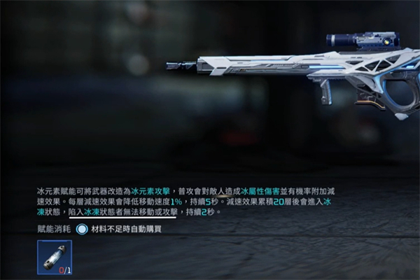 3、冰元素赋能:这种赋能具有冰元素附着,可以减缓敌人的行动,作为控制武器使用。