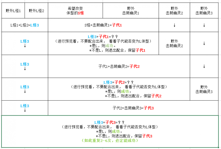 三.利用步骤一和二的怪物进行配合, 达成S体型变成L体型。