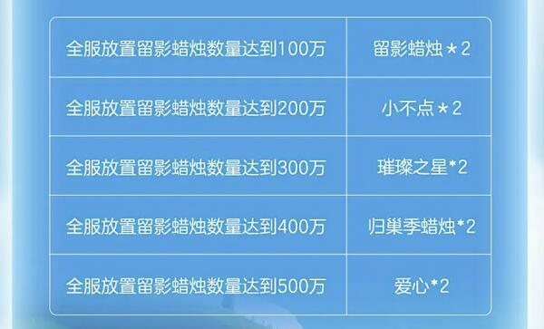 2、全服任务:当全服的留影蜡烛放置数量达到对应档次后全体玩家都可以领取奖励。
