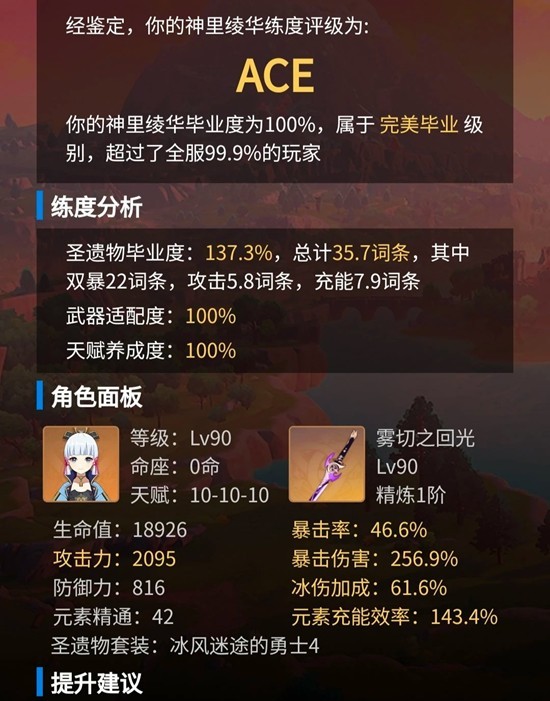 4、神里绫华毕业面板需满足攻击两千一以上、暴击率三十五以上、暴伤两百五以上,天赋至少要达到九九九最好能升至十十十。