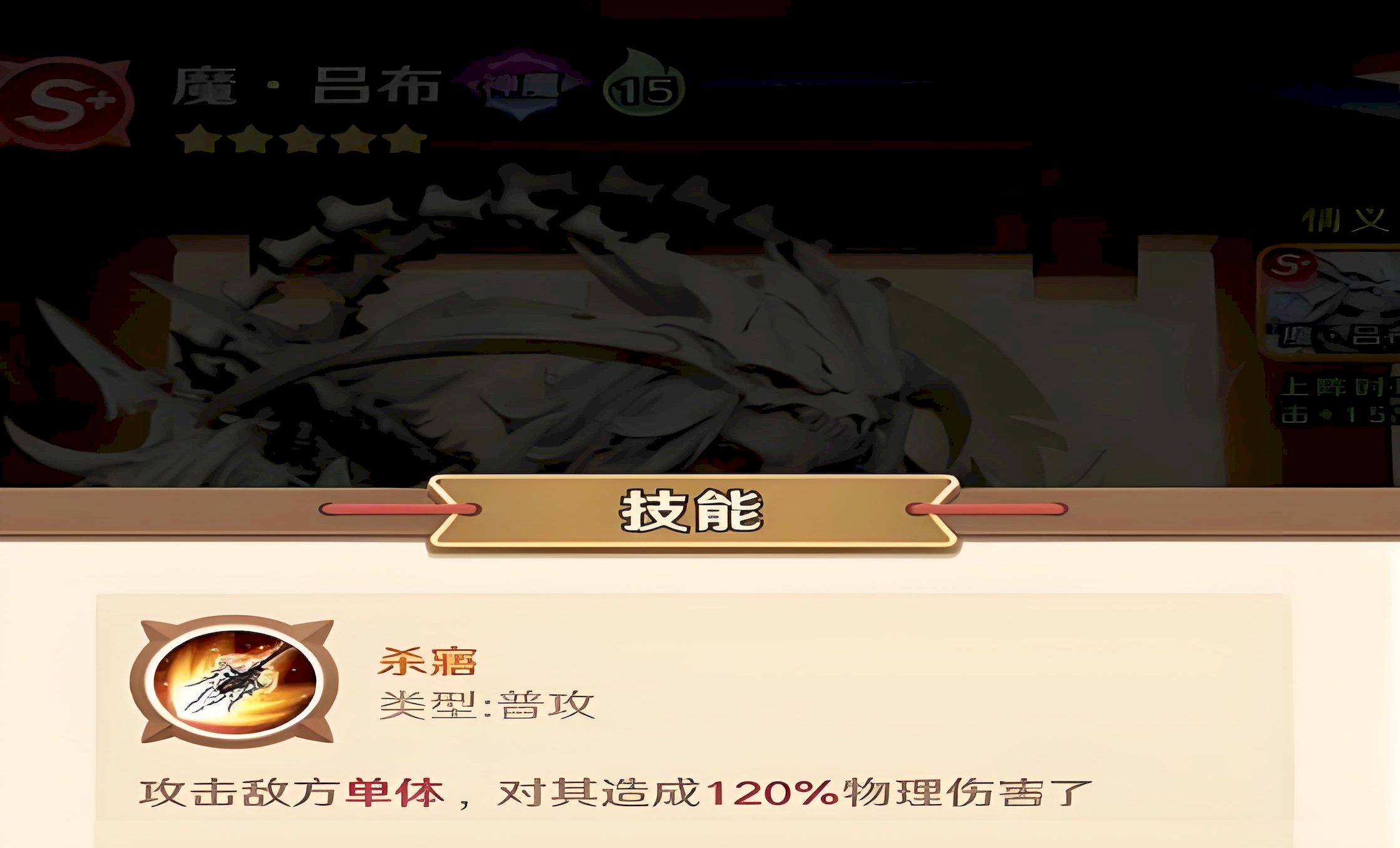 1、魔吕布普攻对单体造成120%伤害,无法释放技能,每次普攻积攒怒气,怒气越高伤害越高,每四次普攻触发群体无视防御攻击。