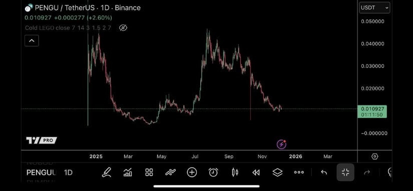 胖企鹅币(PENGU)正试图维持其市场结构,当前价格位于一个长期支撑区域上方,该区域曾促成多次重大趋势反转。本月经历持续下跌后,PENGU现已在0.0100-0.0110美元区间获得买盘响应,尽管市场整体不确定性犹存,但已显现初步企稳迹象。