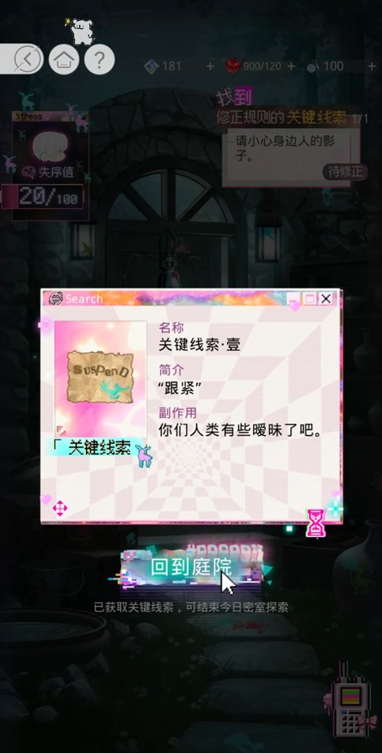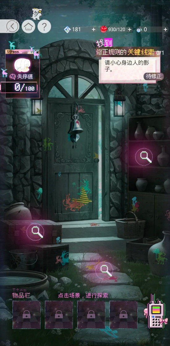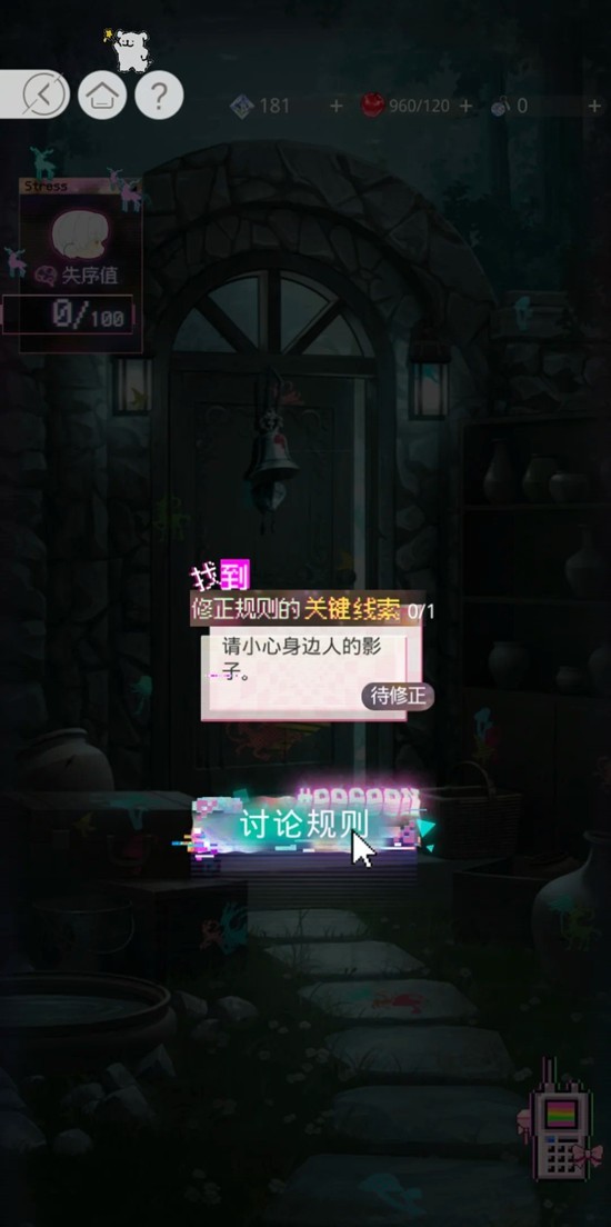 4、探索时用收集道具交互,获取更多道具后找到关键线索,结束当轮探索并修正规则,总计需修正七条规则。