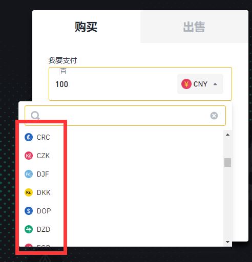 4.选定交易对后设置购买金额,平台支持包括美元在内的百余种发比支付方式,输入100元等具体金额。