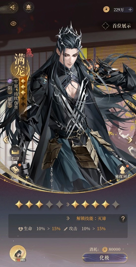 1、满宠为阴属性破军密探,核心定位是Dot队增伤拐,可通过转化罪愆为刑罚,再引爆刑罚为全队提升持续伤害,能大幅拔高Dot队整体战力。