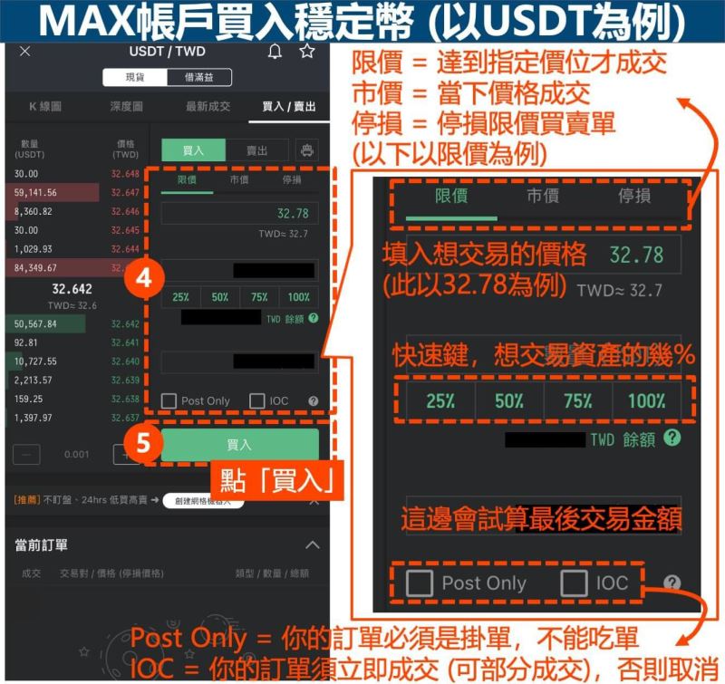 在MAX交易界面选择"USDT/TWD"交易对,可选择限价单或市价单进行购买,注意最小下单量为8 USDT。