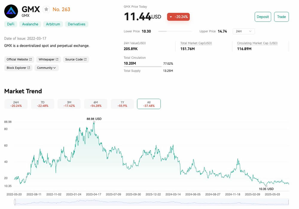 截至2025年7月,GMX市值1.5176亿美元,24小时交易量20.589万美元。历史最高价88.98美元,当前价格11.44美元。