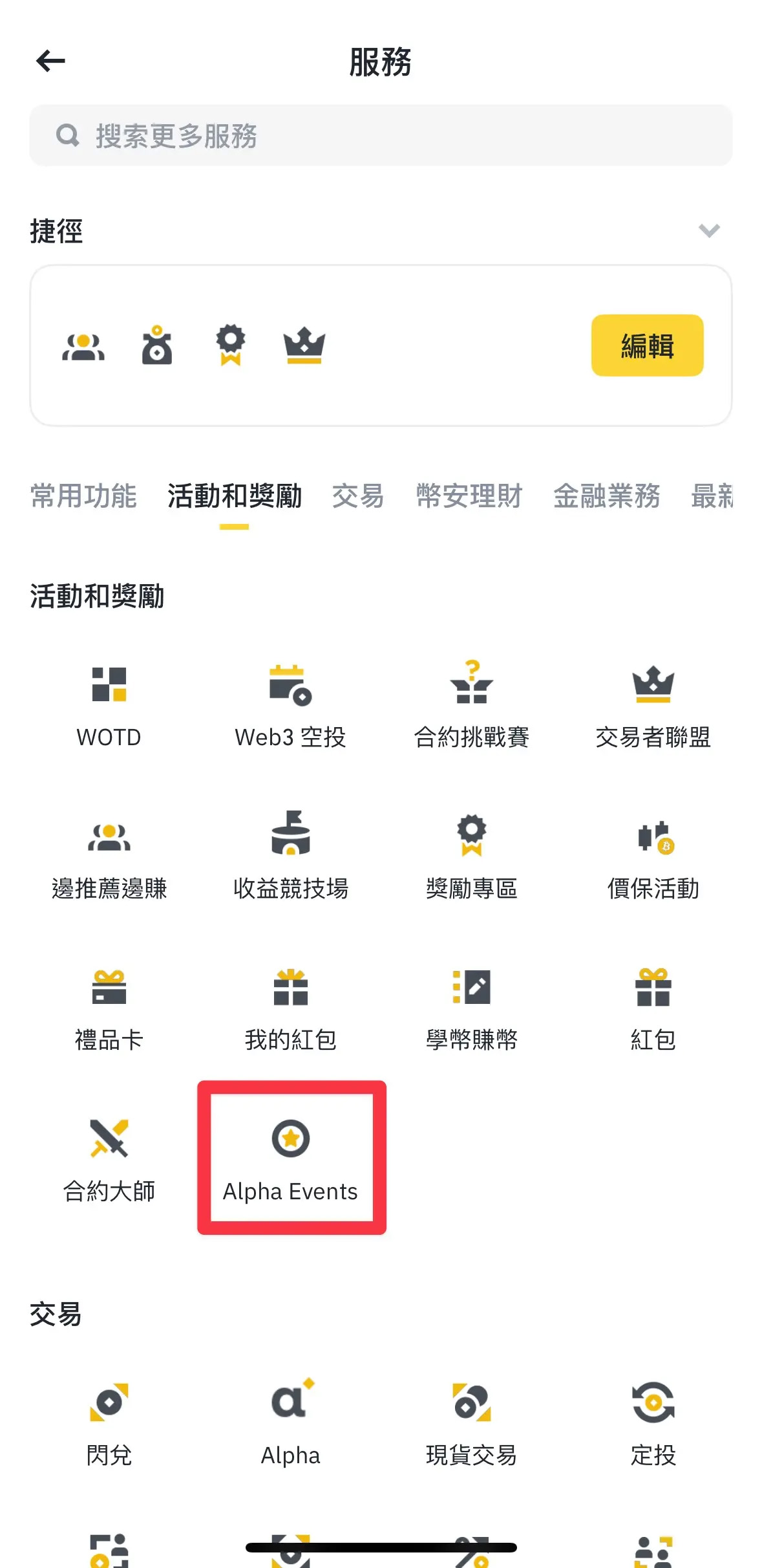 4. 在服务页面找到"Alpha Events"