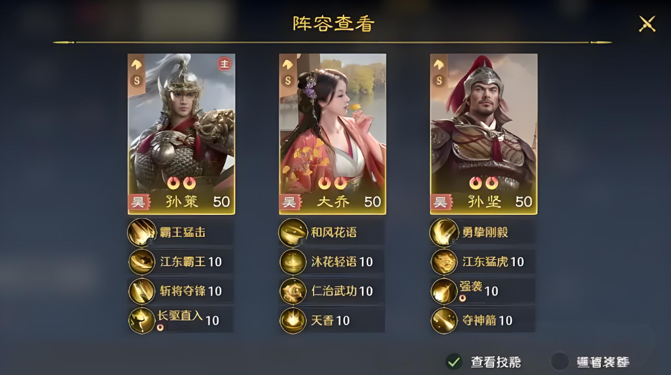 3、东吴铁三角内大乔掌续航增伤,孙坚充前排坦克兼控制,孙策借增益打出高额爆发,形成攻守闭环。