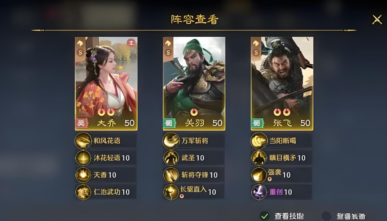 4、大乔可组建桃园平替队,搭配关羽与张飞,契合增伤逻辑,资源投入少,培养周期短,适合零氪微氪。