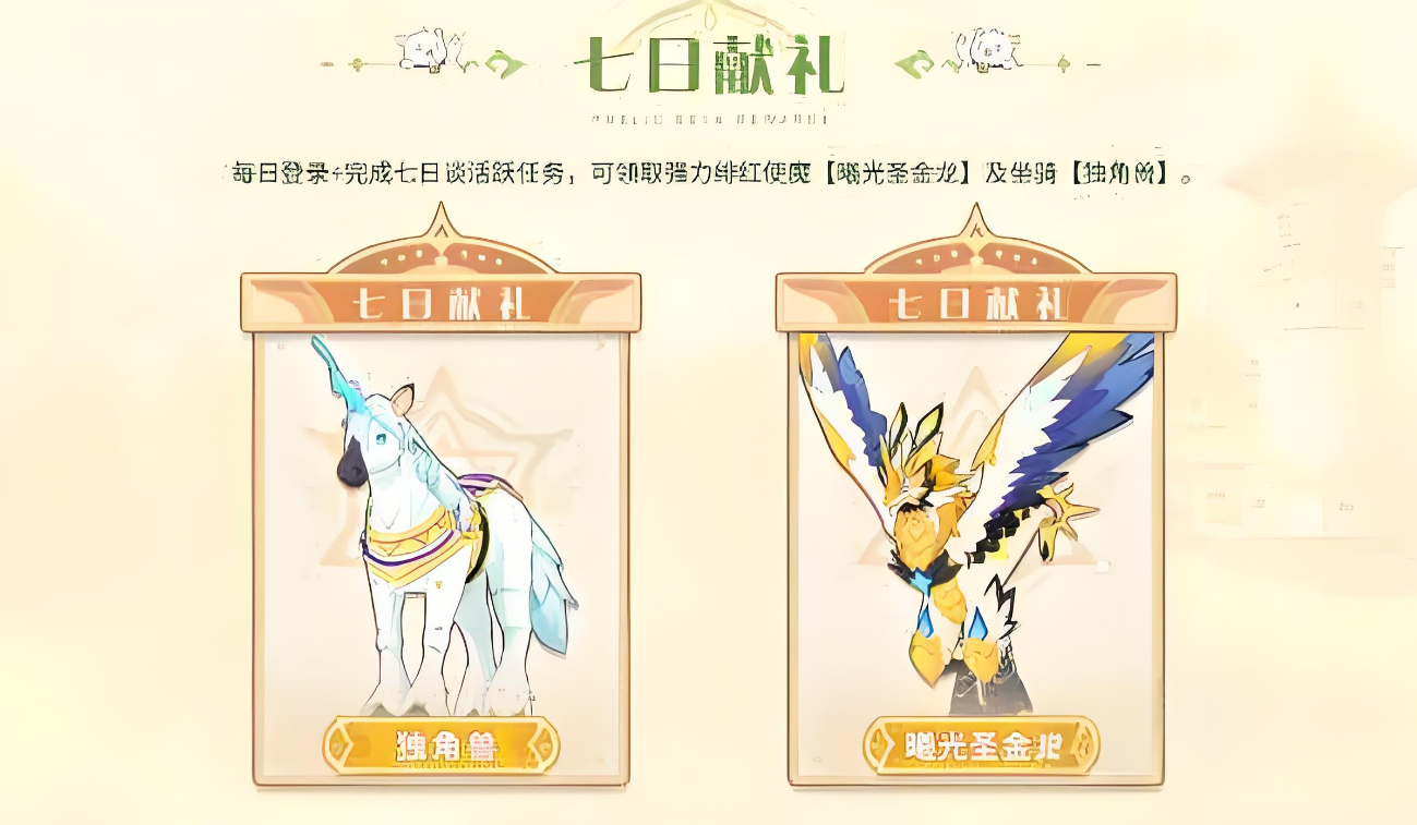 1、独角兽和曦光圣金龙是强度热度双高的宠物,可通过七日献礼获取,仅需每日登录并完成七日活跃任务就能免费得到。