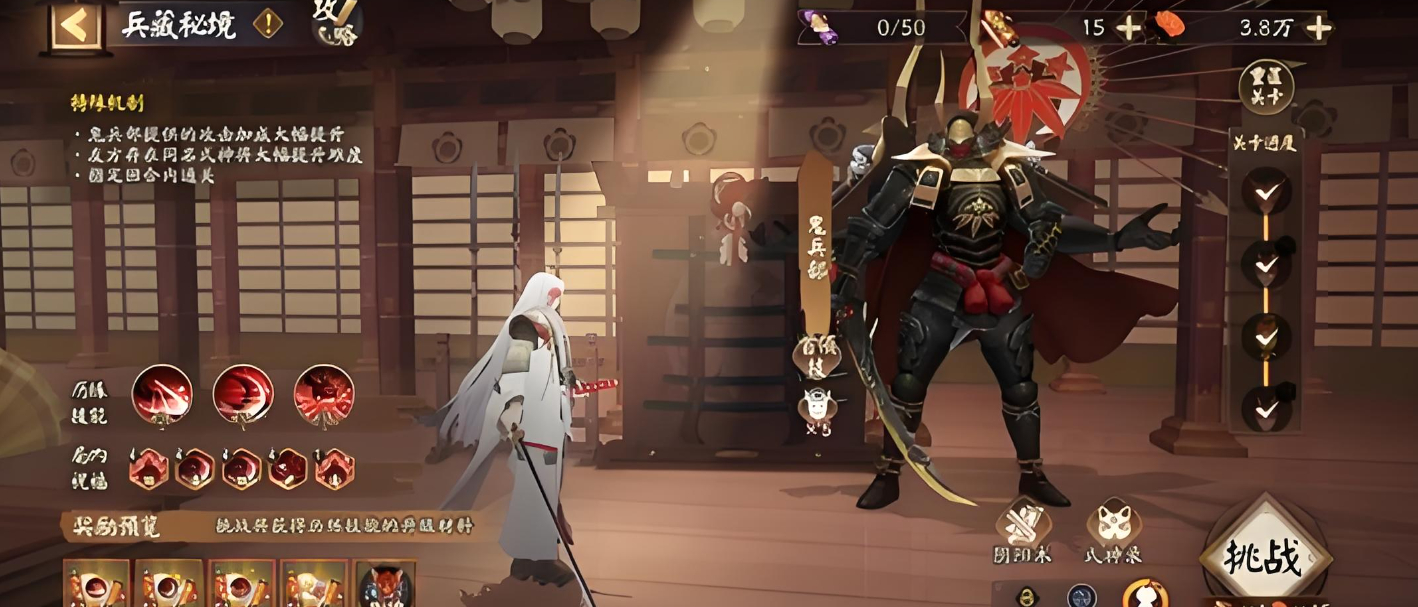 2、历练技能需携带天下布武和鬼神之策,局内祝福按顺序选天下布武绝命,剑之垒乘胜,天下布武血怒,鬼胄追击和鬼胄诱敌。
