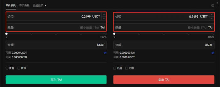 登录后进入市场页面搜索"TAI",点击交易按钮进入买卖界面。输入购买数量确认即可完成交易,卖出操作同理。