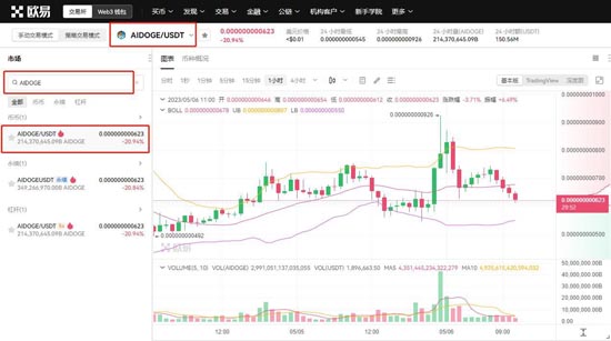 5、搜索AIDOGE/USDT交易对查看实时行情