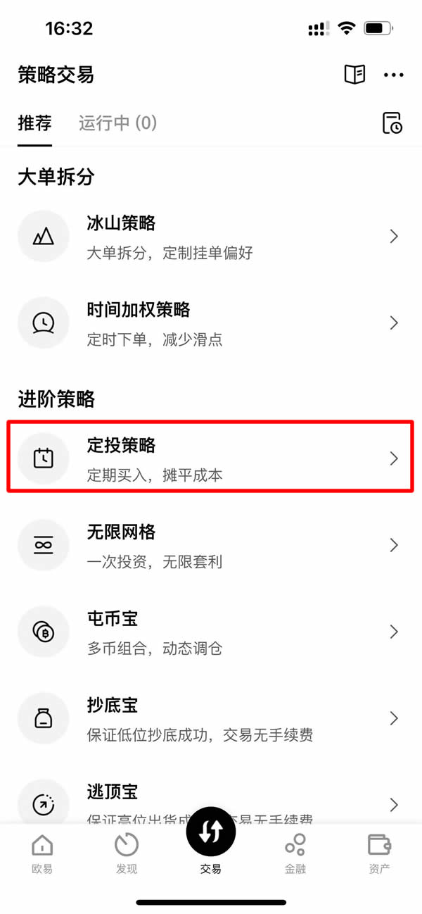 打开OKX APP,依次点击左上角菜单→策略交易→定投策略。