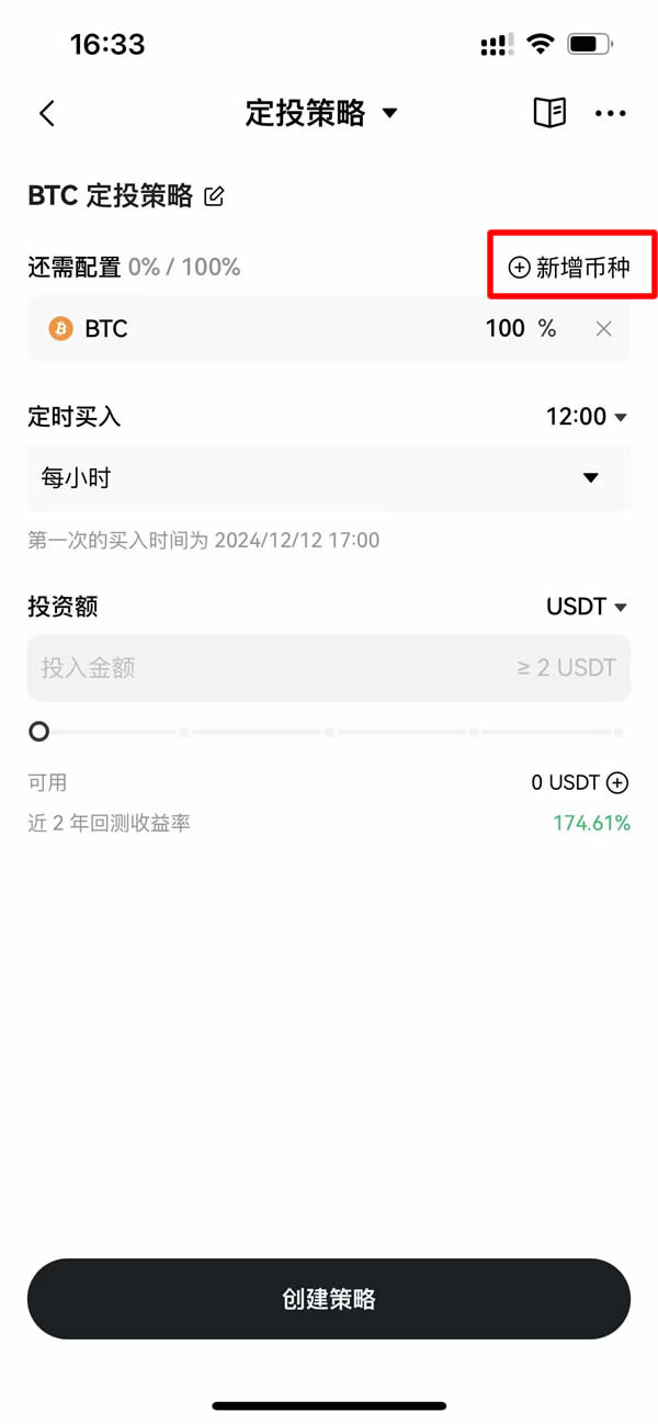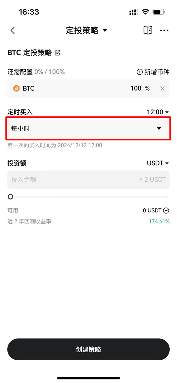 输入投资金额后点击"创建策略"即可完成。建议新手从每月小额开始尝试。