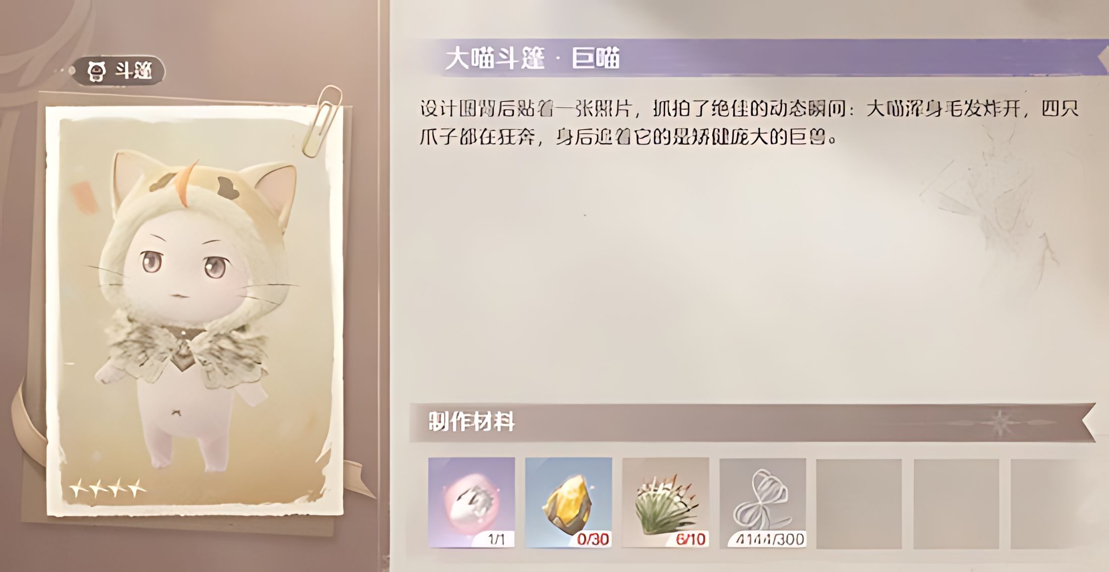 1、巨喵需完成吼晕二十只巨兽的成就,集齐冬桠绒花精粹大地晶珀典雅草裙毛团丝线等材料,按要求筹备后就能解锁该款装扮。