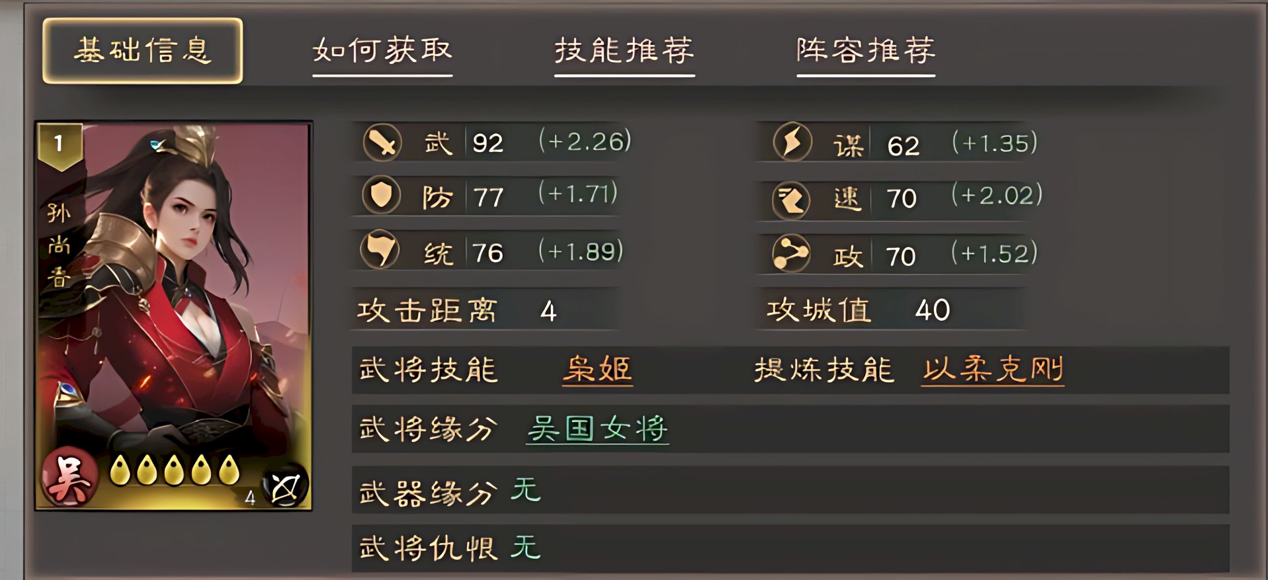 2、基础属性均衡且成长可观,武92防77谋62统76,各项属性增长合理,为输出与生存提供坚实基础。