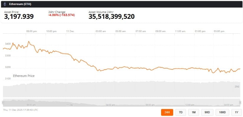 截至发稿,以太坊报3197美元,24小时下跌4.86%。来源:Brave New Coin以太坊价格