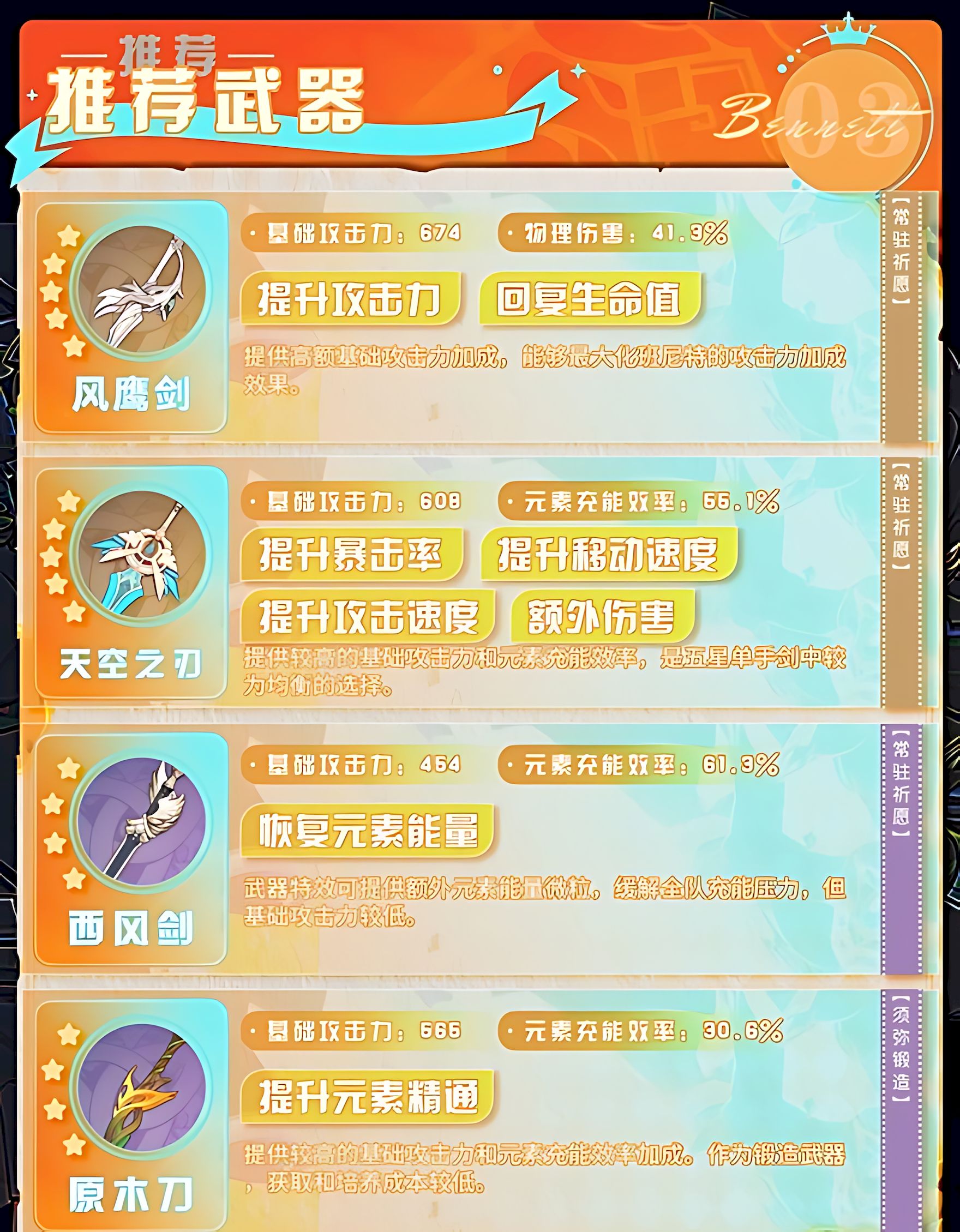 3、武器推荐风鹰剑天空之刃原木刀及西风剑,分别主打高额基础攻击均衡属性充能效率和缓解全队充能压力。