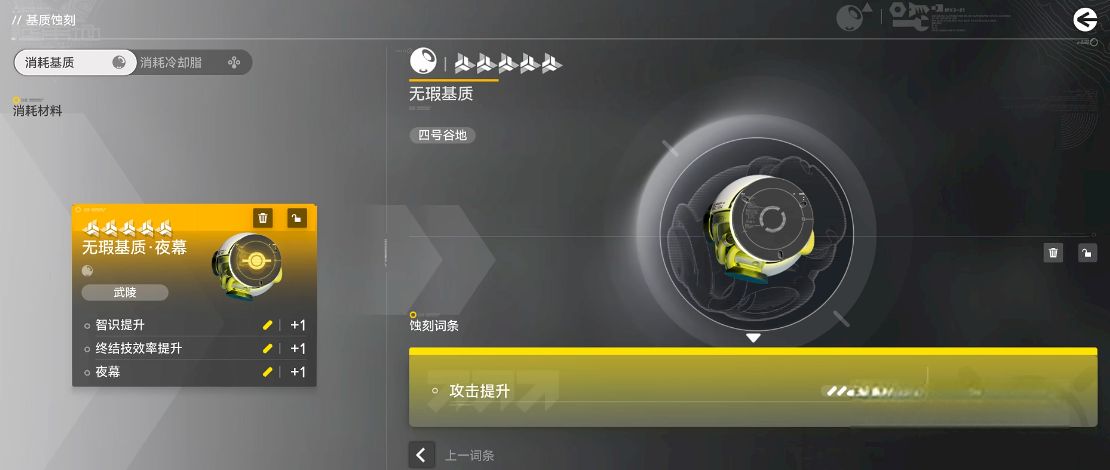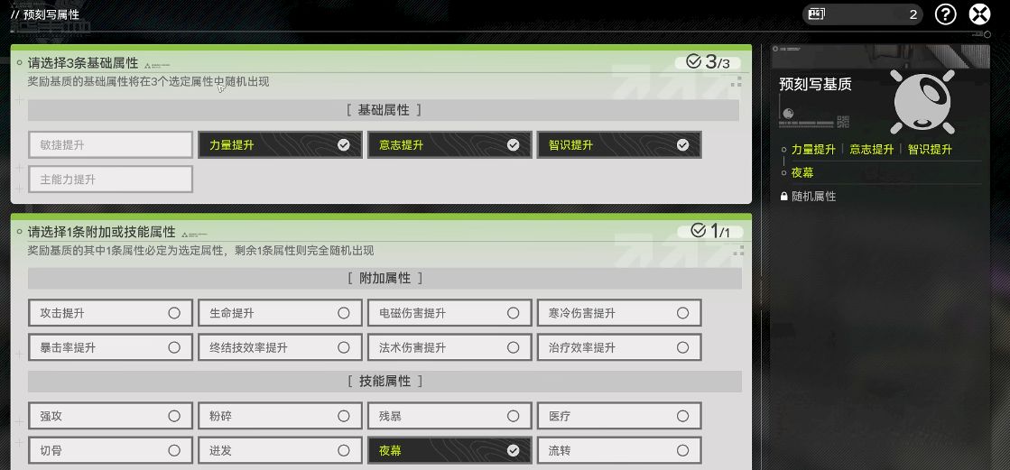 2、使用流程有固定步骤,通过预刻写基质页面操作,先选三条基础属性再选一条附加或技能属性,可刷新优化。