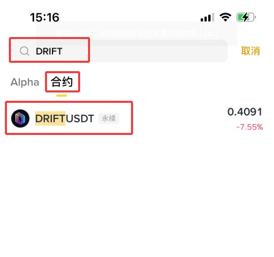 3.输入"DRIFT",在下拉菜单中选择【DRIFTUSDT】合约