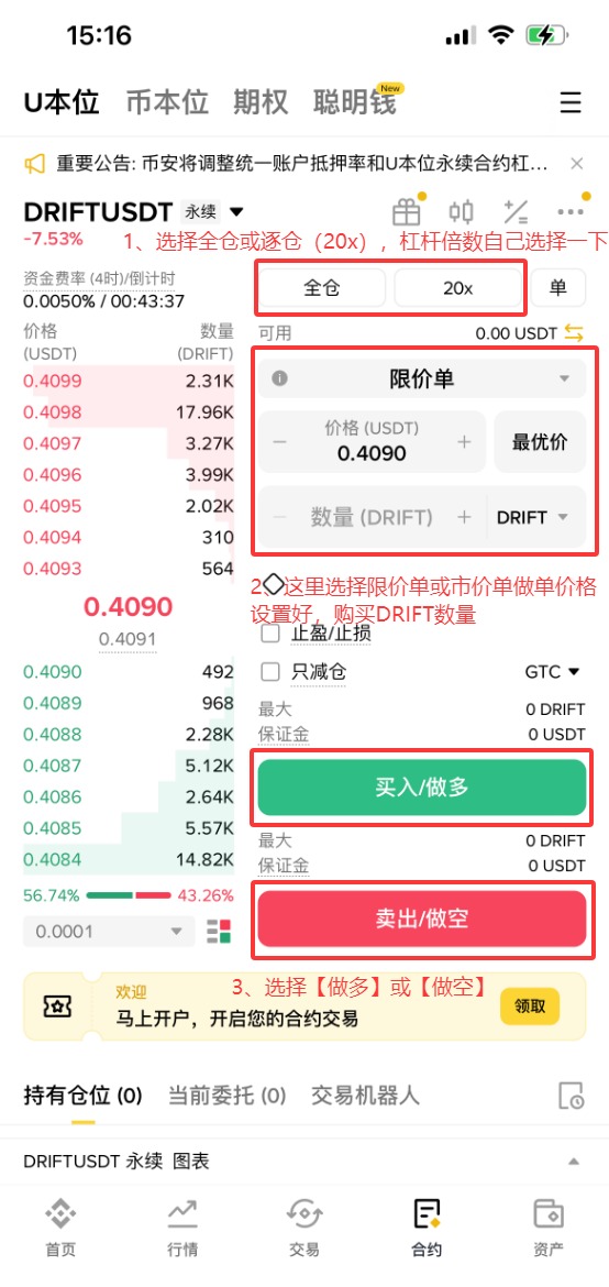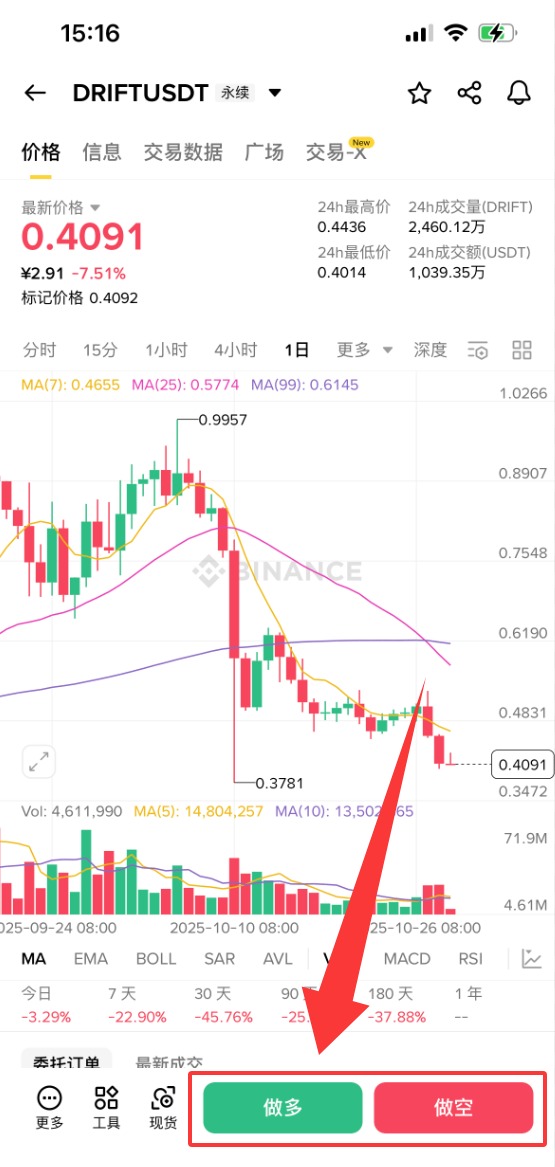 币安现已开通DRIFT永续合约交易对(DRIFT/USDT),支持1-50倍灵活杠杆。相较于现货交易,合约交易能让您通过判断价格走势,以更小成本撬动更大收益空间。
