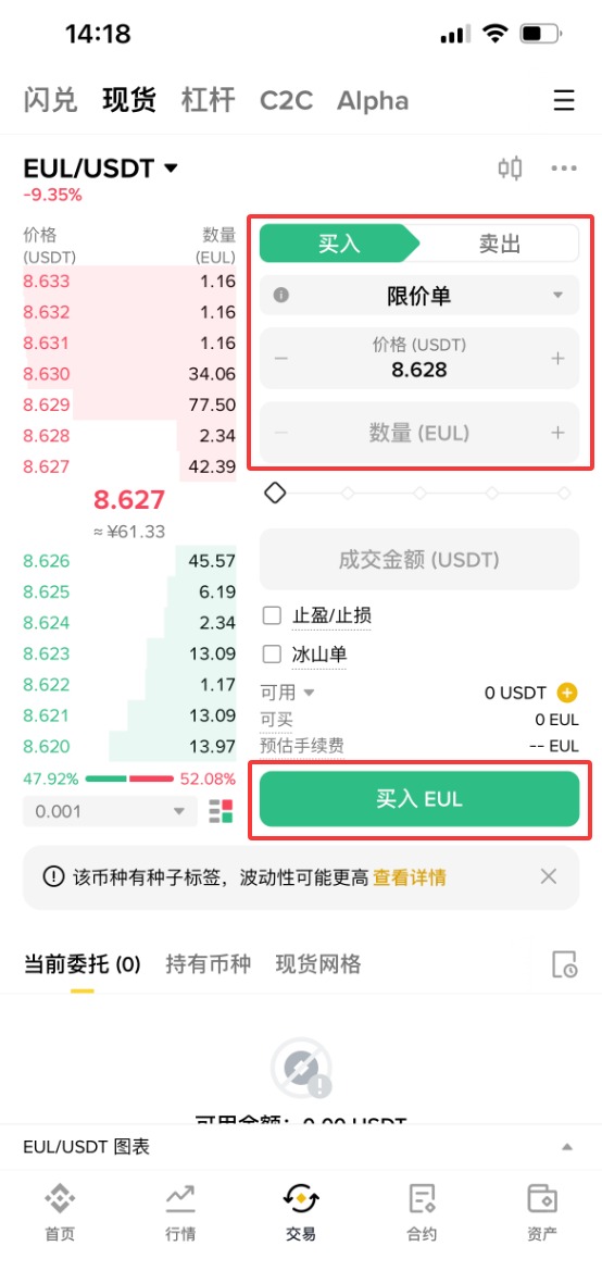3.输入EUL搜索,选择现货交易的EUL/USDT交易对