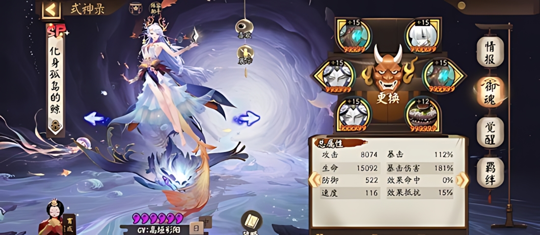3、日和坊应携带树妖套装,主堆生生暴属性,主要职责是为sp千姬提供回血保障,维持队伍生存能力。