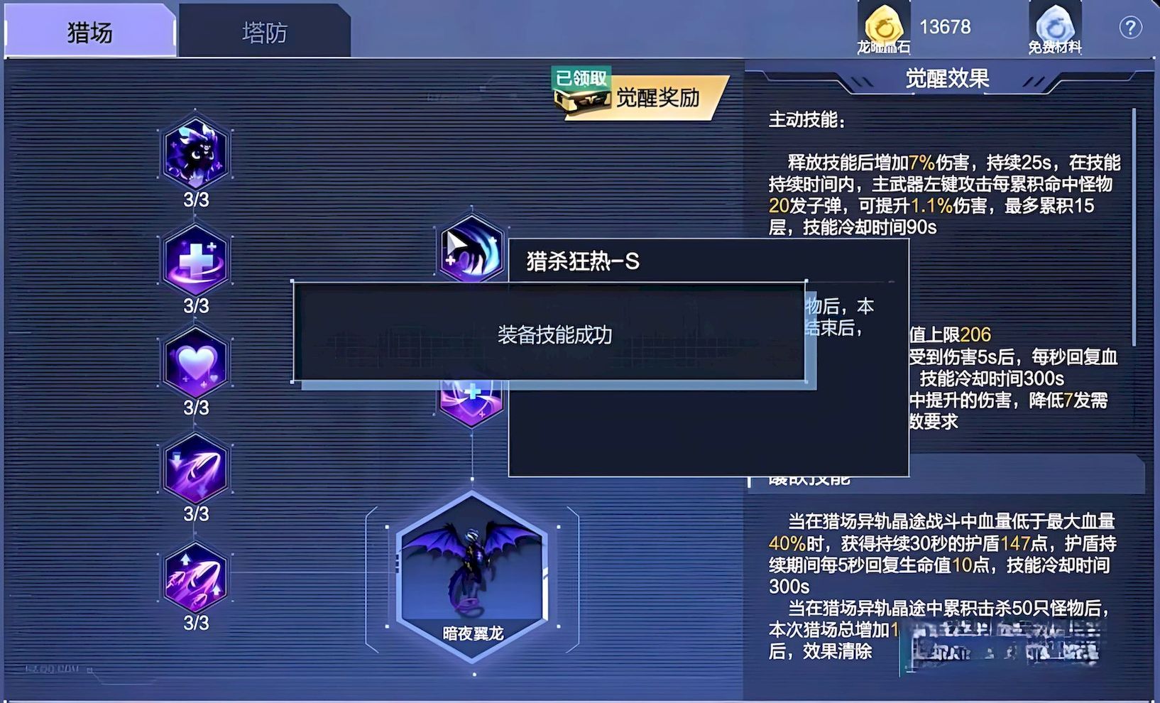 5、暗夜翼龙觉醒后有多重加成,奇偶波次分别提升击杀金币,放置陷阱减耗,释放技能可提高陷阱金币收益。