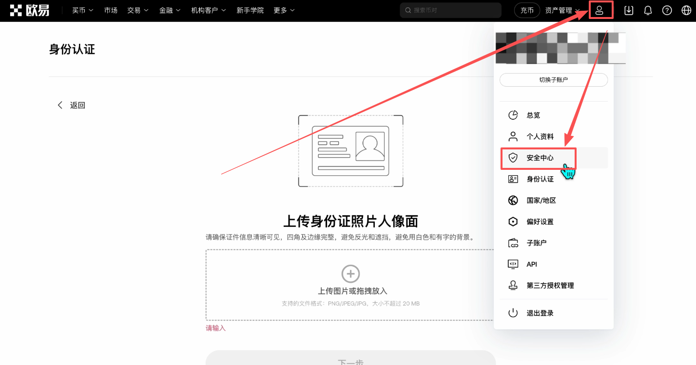实名认证不仅能解锁平台全部交易功能,也是保护账户安全的重要措施。经过认证的账户在遇到安全问题时,平台能提供更有效的身份验证和恢复服务。身份认证成功之后,我们可以点击右上角的小人头,找到【安全中心】。