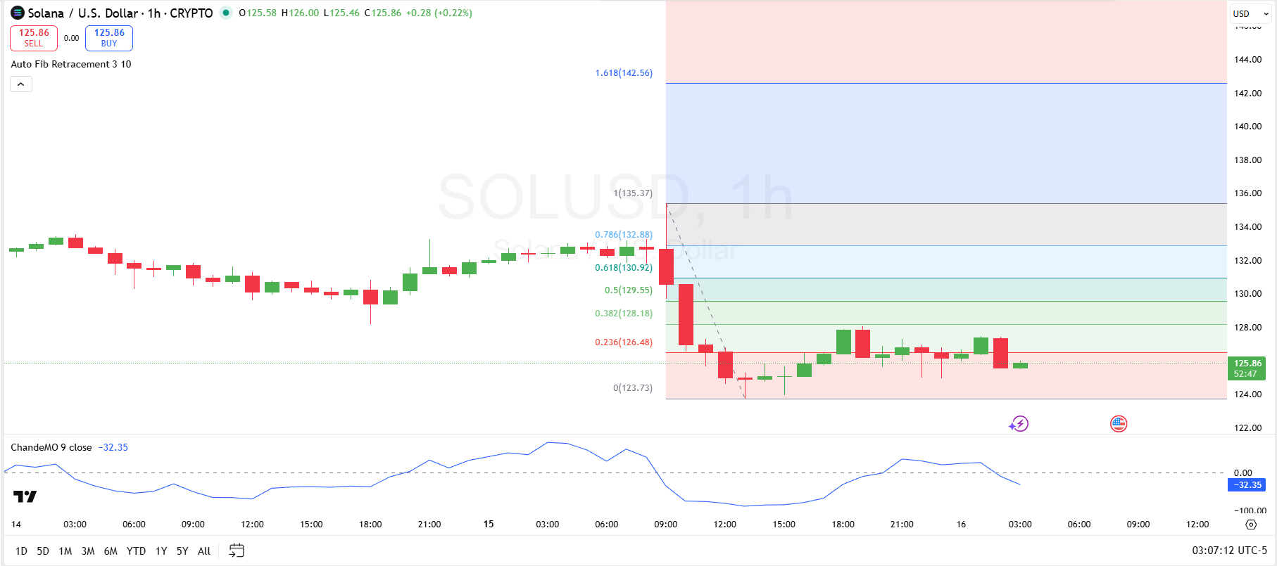 观察TradingView图表可见,Solana当前交易于126.48美元(0.236斐波那契回撤位)下方,表明卖方仍掌控价格走势。但可见一根绿色蜡烛正试图挑战该阻力位。