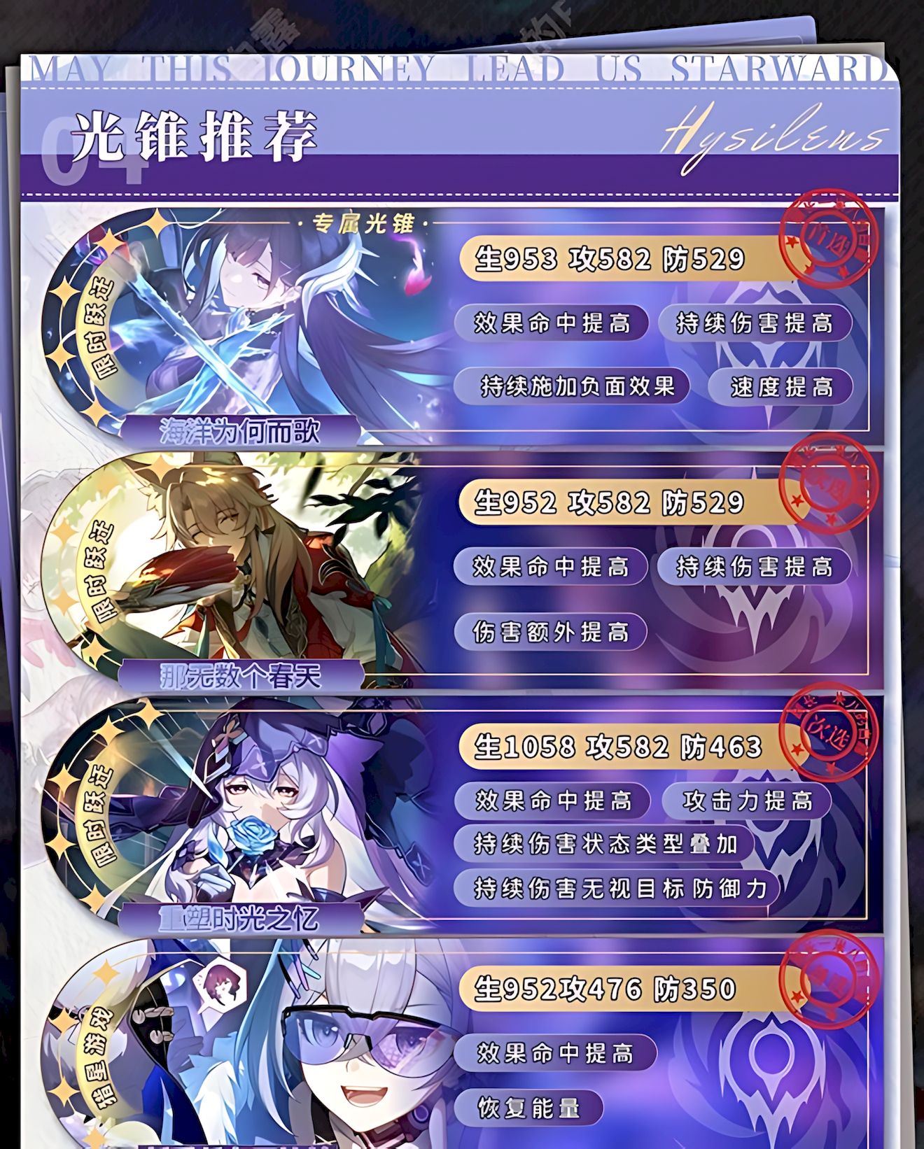 3、光锥推荐海洋为何而歌等,专属光锥提升持续伤害与效果命中低星光锥新手任务开始前也能满足基础需求。